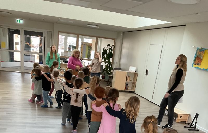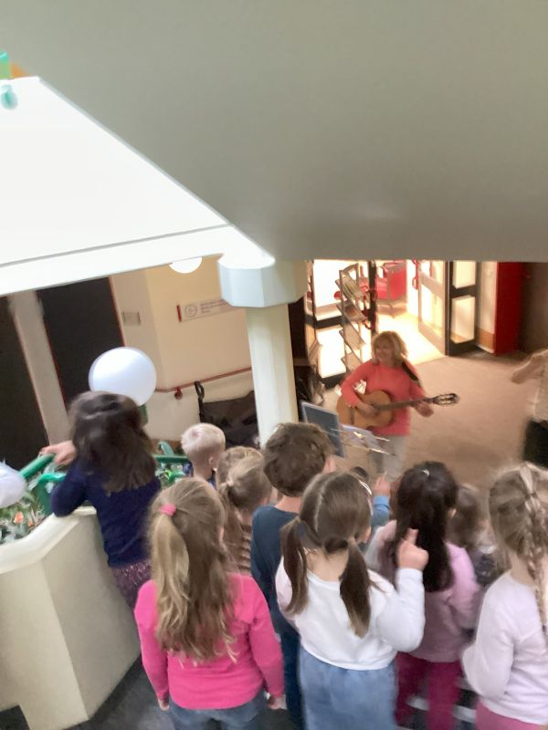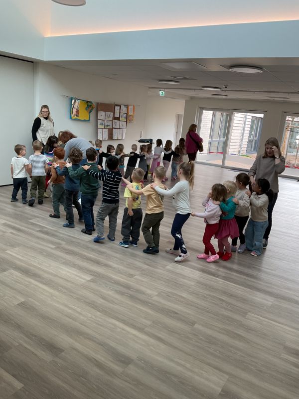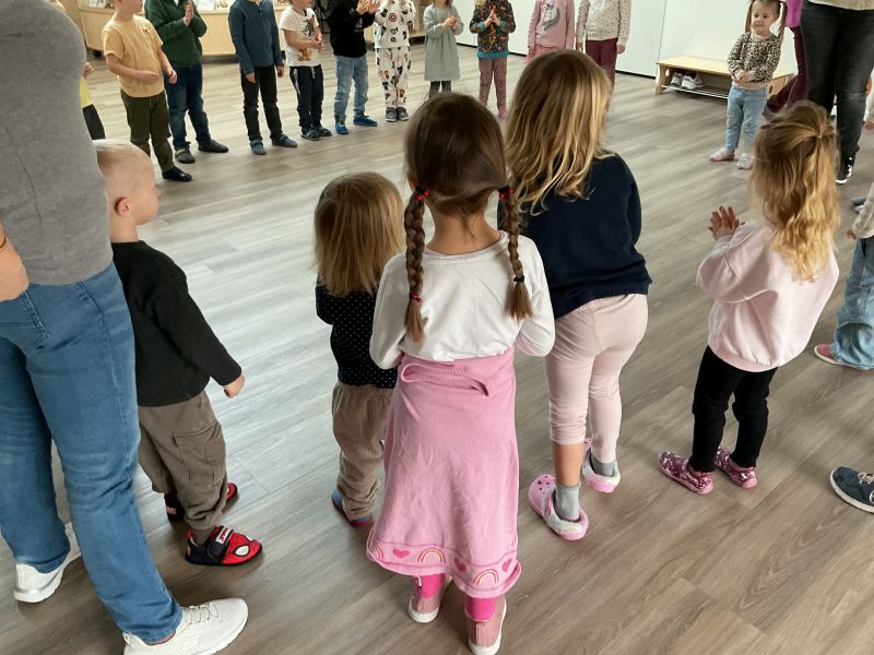 Bei uns liegt Musik in der Luft! Singspiele und Lieder gehören zu den täglichen Ritualen im Morgenkreis. Reime und Rhythmus fördern die Sprachentwicklung und gemeinsames Singen schult nicht nur das Gehör und die Stimme, sondern erzeugt Glücksgefühle. Wöchentlich sind die Kindergartenkinder gruppenübergreifend eingeladen, im Kita-Chor gemeinsam zu singen, musizieren und/ oder tanzen. Eine besondere Freude für alle Beteiligten ist es, wenn wir im Altenheim Simeon und Hanna auftreten. Für die Krippenkinder ist der „Liederkoffer“ ein wichtiges Highlight zum Wochenende.